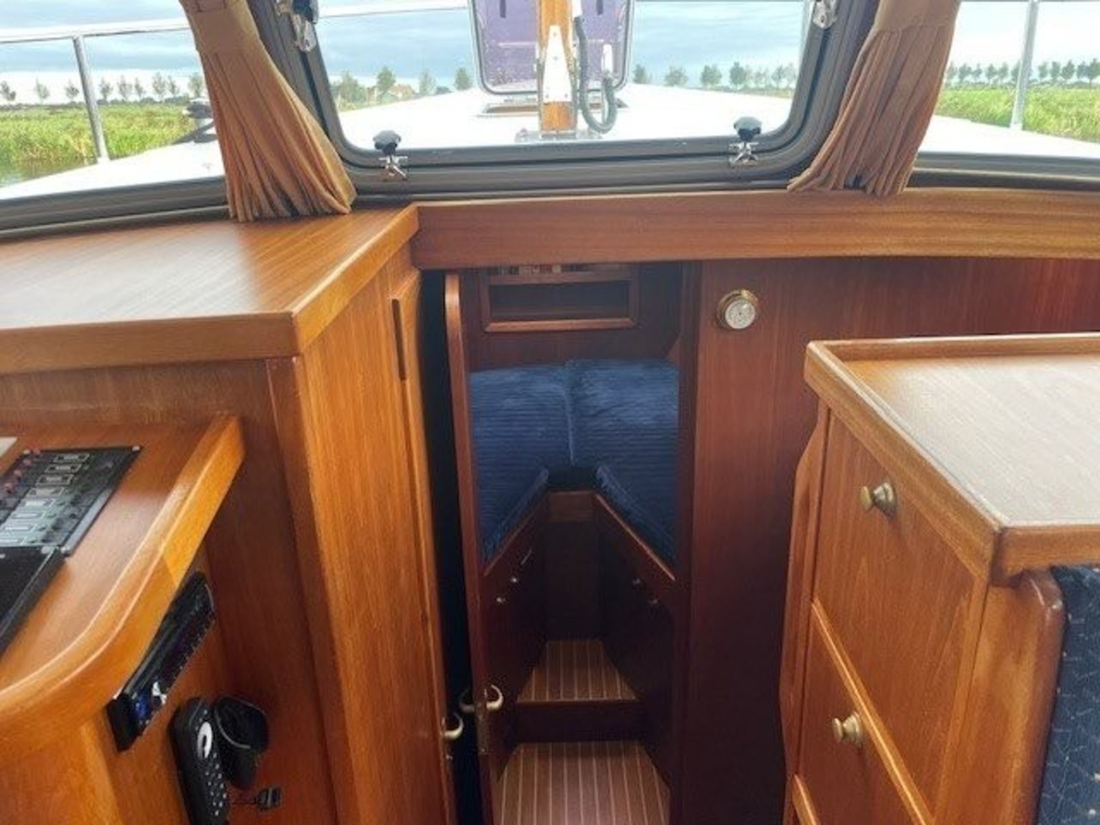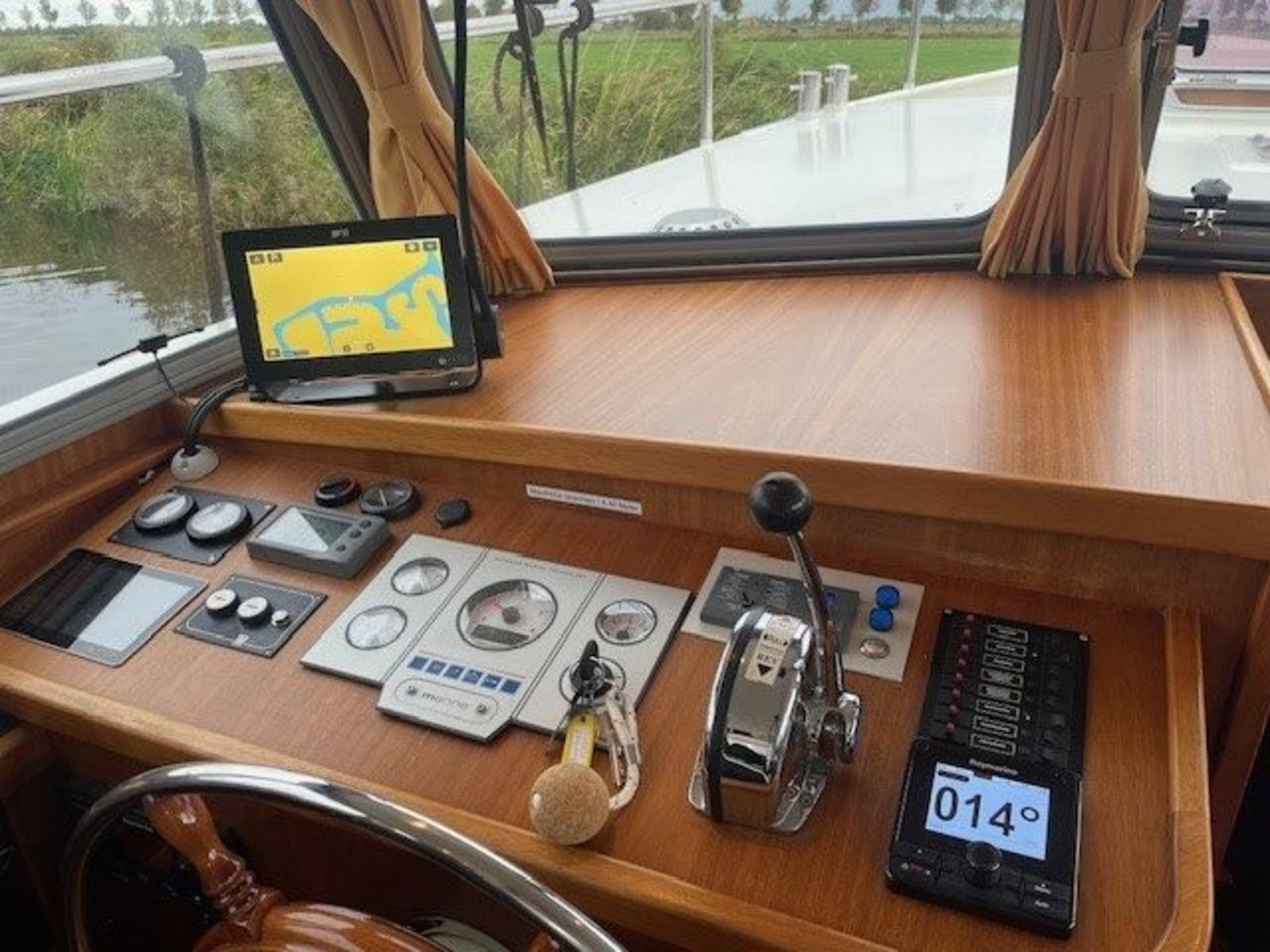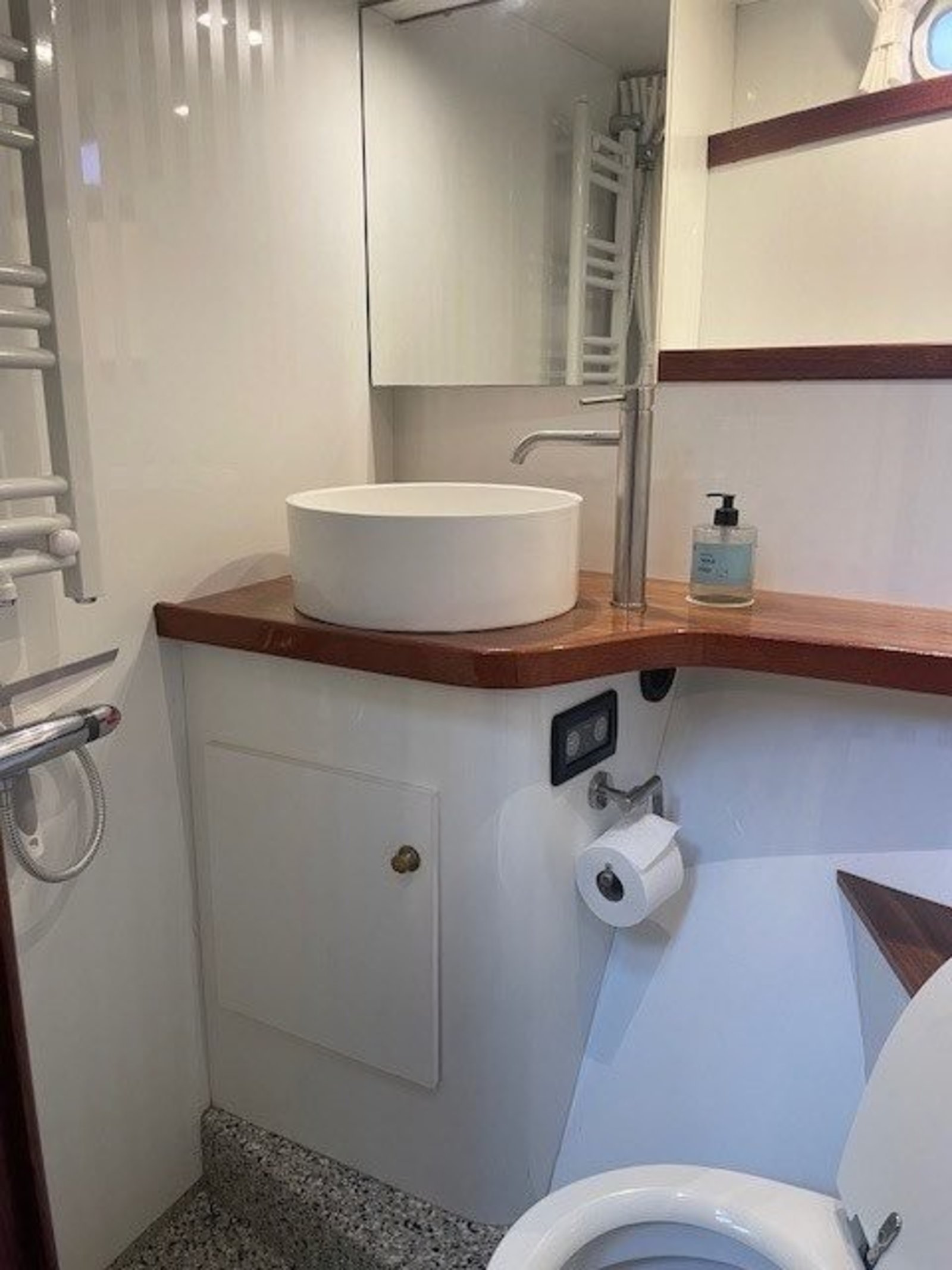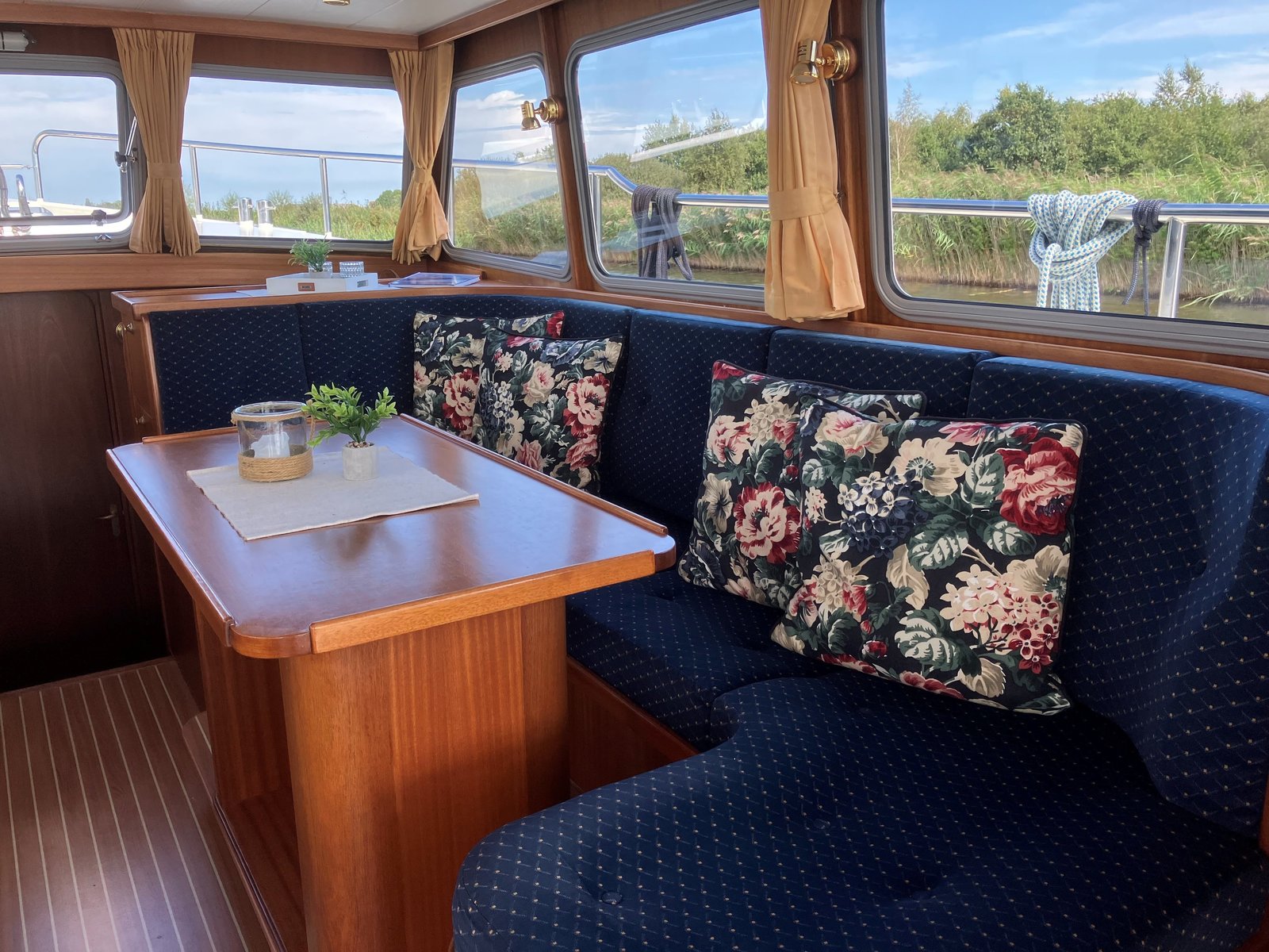 Die Yacht gleitet sanft und effizient durchs Wasser, angetrieben von einem leisen VW-Dieselmotor unter dem Achterdeck. Dank ihres flachen Profils und der geringen Größe liegt sie auch bei starkem Wind stabil im Wasser und ist leicht zu handhaben. Der gesamte Innenraum ist ebenerdig und schafft so einen barrierefreien Wohnraum. Der Übergang vom Cockpit zum Salon ist fließend – nur drei Stufen führen über die gesamte Yacht nach unten zu den Schlafräumen und WC/Dusche. Zudem ist die Yacht dank der praktischen proportionalen Bug- und Heckstrahlruder leicht zu manövrieren, was das An- und Ablegen vereinfacht. Darüber hinaus verfügt das Schiff über ein komfortables Badezimmer mit stilvollen Walnussholz-Elementen und einem Keramikwaschbecken. Ein beheizter Handtuchhalter sorgt für zusätzlichen Komfort. Die voll ausgestattete Bordküche umfasst einen Kühlschrank, einen Drei-Flammen-Gasherd und eine Mikrowelle.