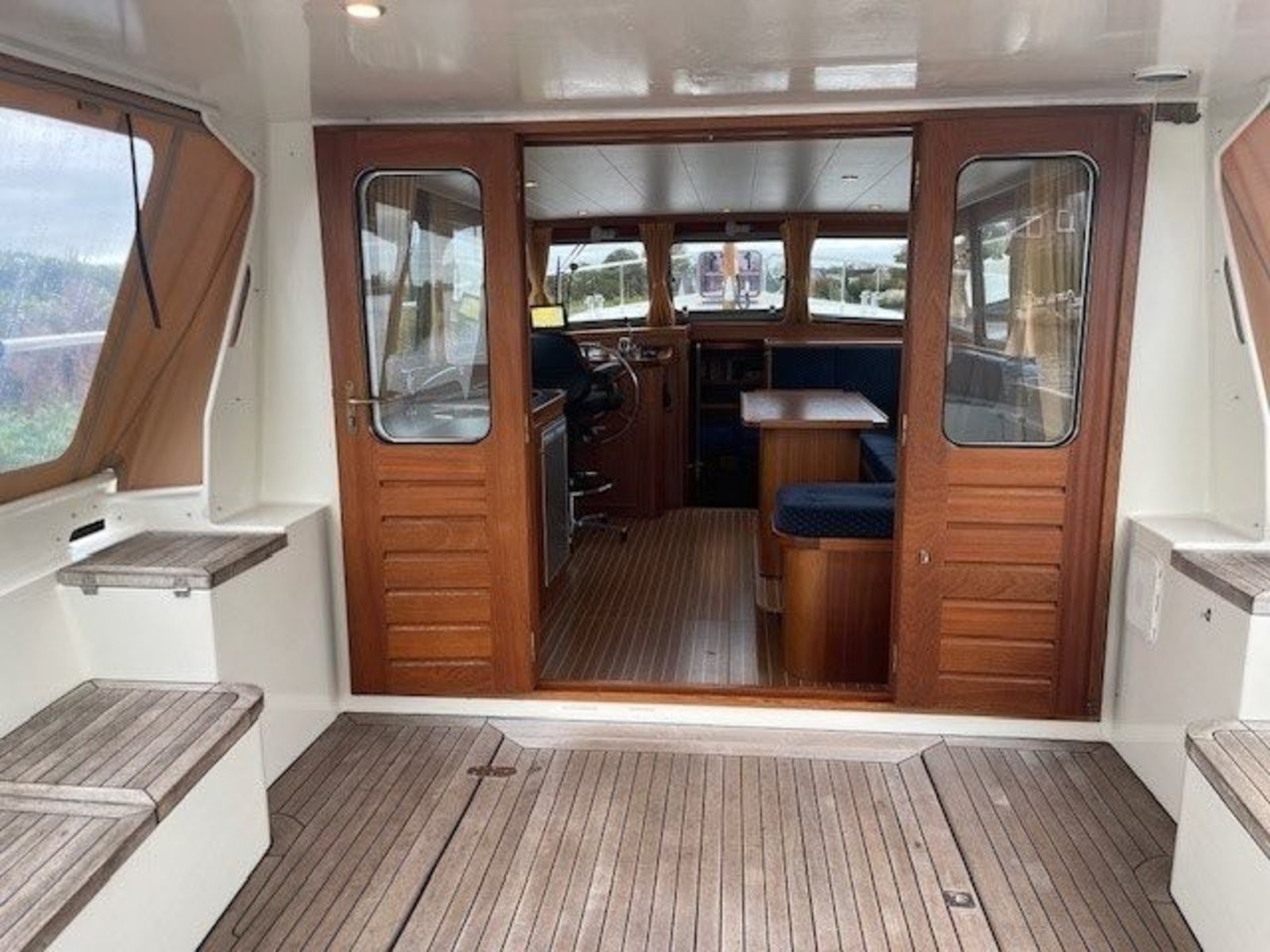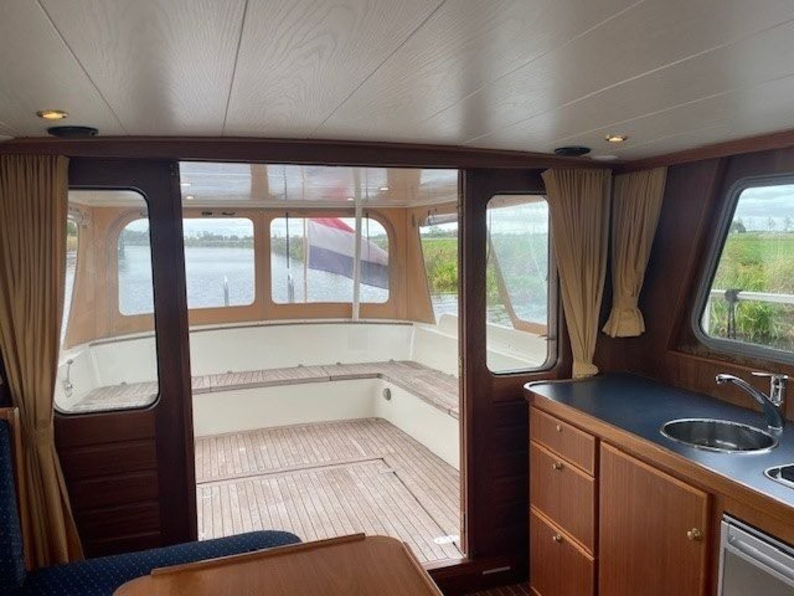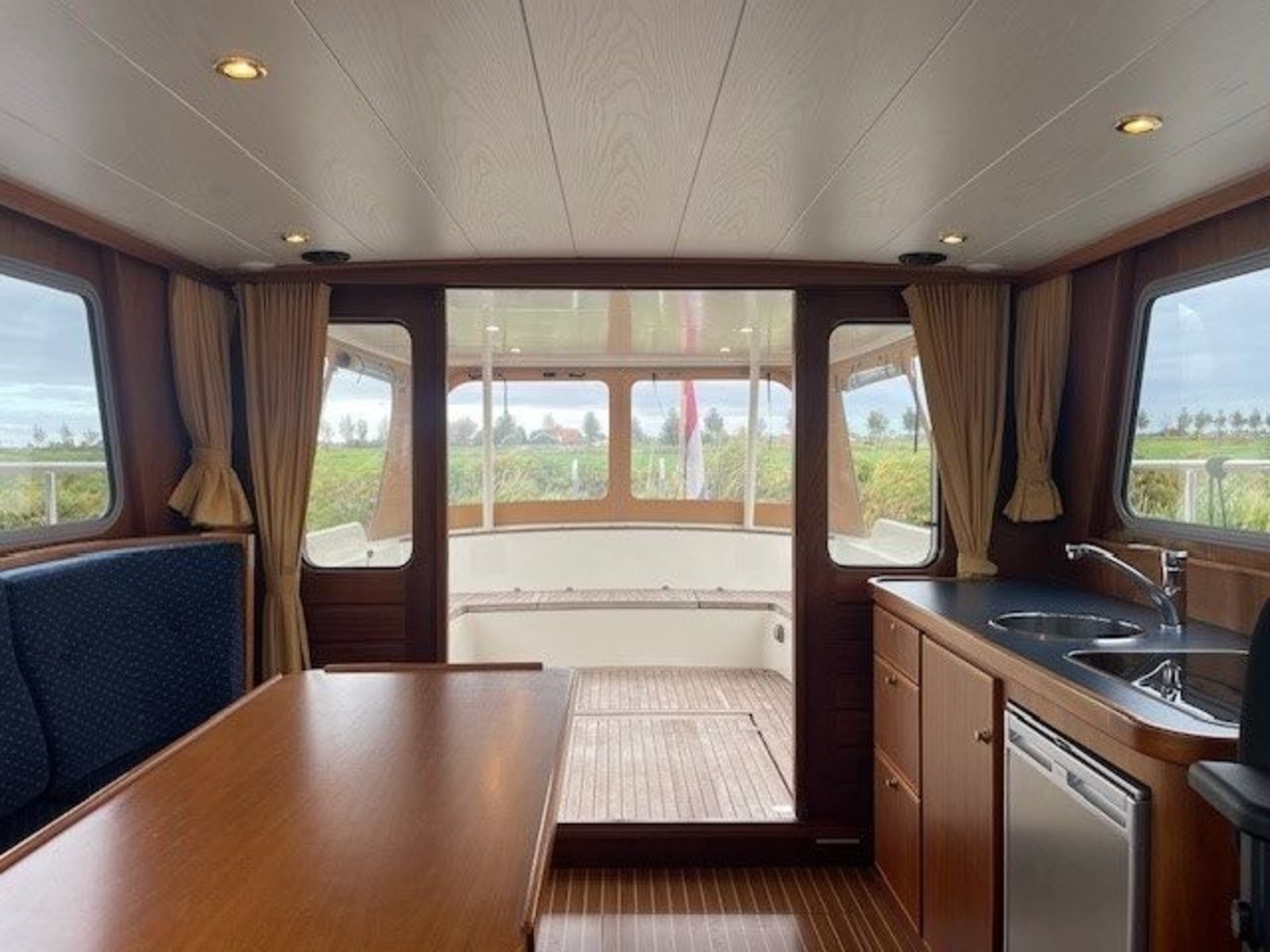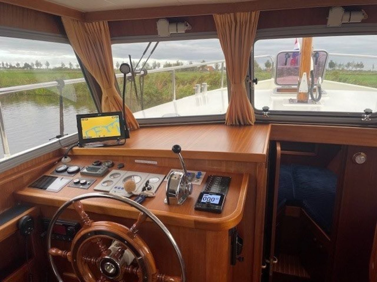 Die Yacht gleitet sanft und effizient durchs Wasser, angetrieben von einem leisen VW-Dieselmotor unter dem Achterdeck. Dank ihres flachen Profils und der geringen Größe liegt sie auch bei starkem Wind stabil im Wasser und ist leicht zu handhaben. Der gesamte Innenraum ist ebenerdig und schafft so einen barrierefreien Wohnraum. Der Übergang vom Cockpit zum Salon ist fließend – nur drei Stufen führen über die gesamte Yacht nach unten zu den Schlafräumen und WC/Dusche. Zudem ist die Yacht dank der praktischen proportionalen Bug- und Heckstrahlruder leicht zu manövrieren, was das An- und Ablegen vereinfacht. Darüber hinaus verfügt das Schiff über ein komfortables Badezimmer mit stilvollen Walnussholz-Elementen und einem Keramikwaschbecken. Ein beheizter Handtuchhalter sorgt für zusätzlichen Komfort. Die voll ausgestattete Bordküche umfasst einen Kühlschrank, einen Drei-Flammen-Gasherd und eine Mikrowelle.