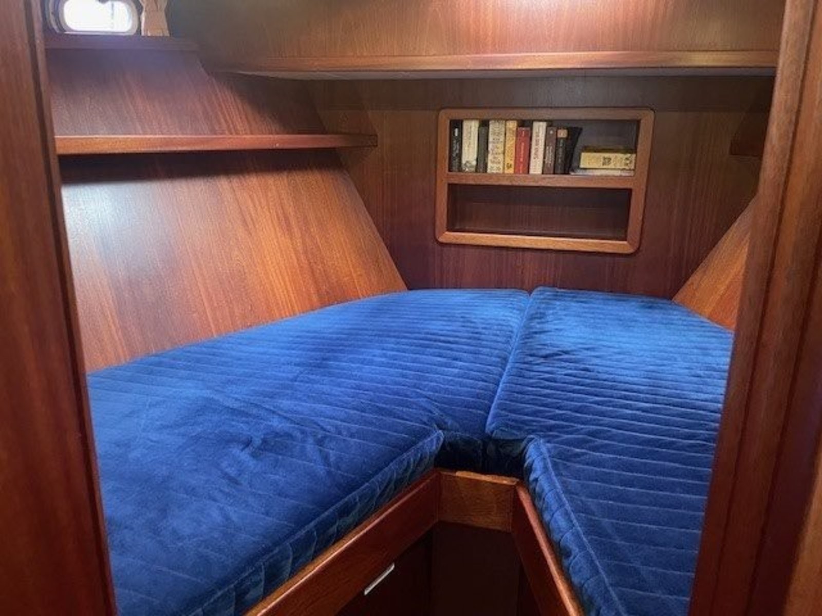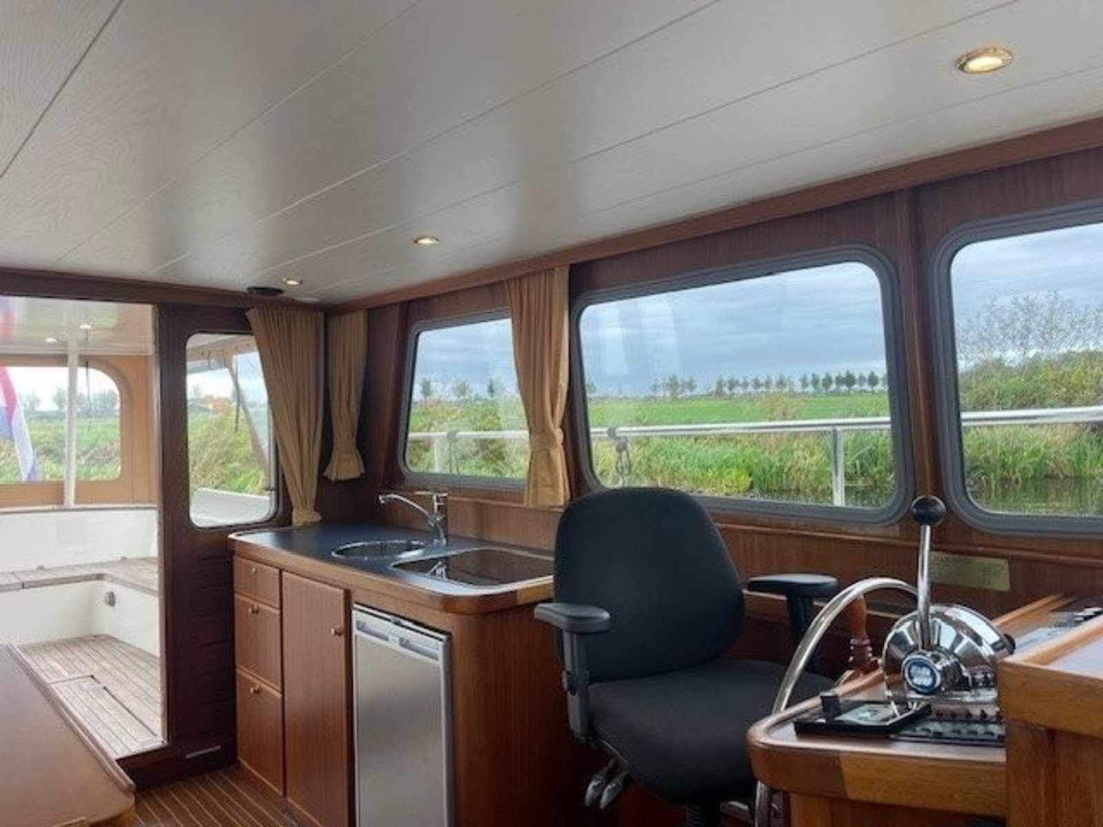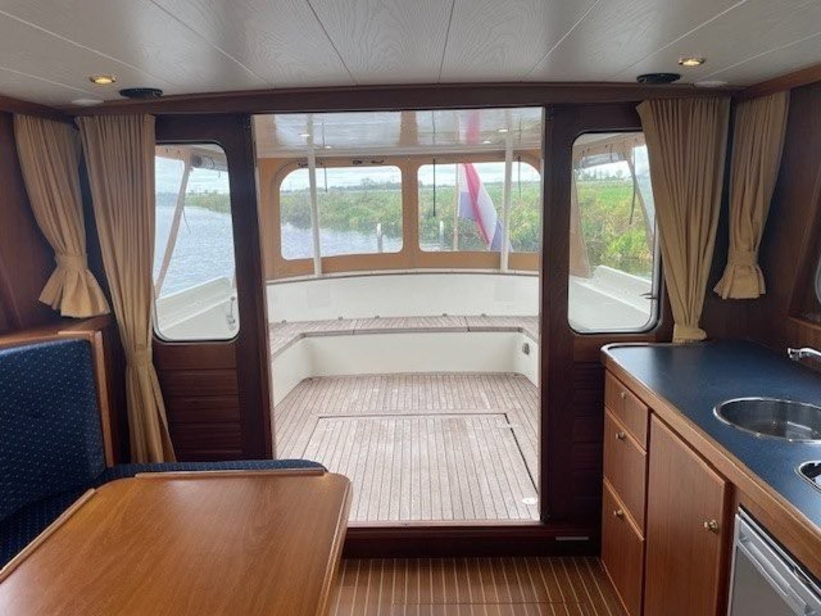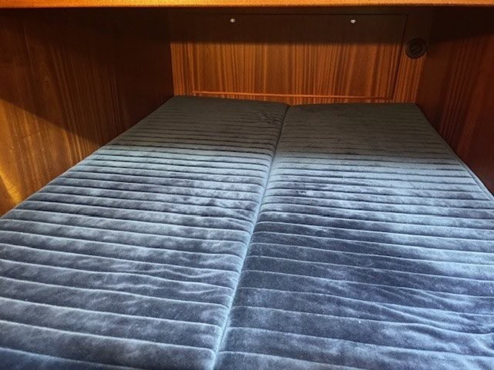 Die Yacht gleitet sanft und effizient durchs Wasser, angetrieben von einem leisen VW-Dieselmotor unter dem Achterdeck. Dank ihres flachen Profils und der geringen Größe liegt sie auch bei starkem Wind stabil im Wasser und ist leicht zu handhaben. Der gesamte Innenraum ist ebenerdig und schafft so einen barrierefreien Wohnraum. Der Übergang vom Cockpit zum Salon ist fließend – nur drei Stufen führen über die gesamte Yacht nach unten zu den Schlafräumen und WC/Dusche. Zudem ist die Yacht dank der praktischen proportionalen Bug- und Heckstrahlruder leicht zu manövrieren, was das An- und Ablegen vereinfacht. Darüber hinaus verfügt das Schiff über ein komfortables Badezimmer mit stilvollen Walnussholz-Elementen und einem Keramikwaschbecken. Ein beheizter Handtuchhalter sorgt für zusätzlichen Komfort. Die voll ausgestattete Bordküche umfasst einen Kühlschrank, einen Drei-Flammen-Gasherd und eine Mikrowelle.